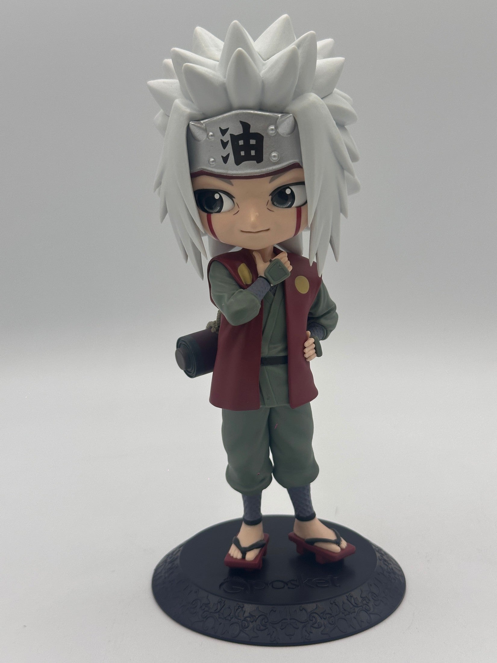 Add this charming Qposket figure of Jiraiya , one of Naruto 's legendary Sannin, to your collection. With his signature wide-eyed style and smoothed details, this sculpture offers a tender and stylized interpretation of the wise ninja.
